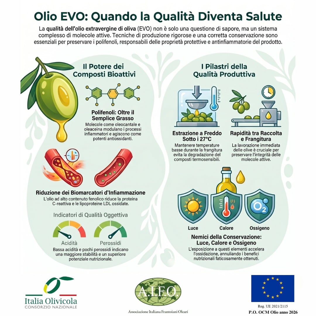 È quanto emerge dal percorso di approfondimento sviluppato nel mese di aprile da AIFO, associazione frantoiani italiani, che dopo aver evidenziato il ruolo dell’olio extravergine nella prevenzione e le caratteristiche dei grassi “buoni”, si concentra ora su un aspetto chiave: la relazione tra qualità del prodotto e valore nutrizionale.