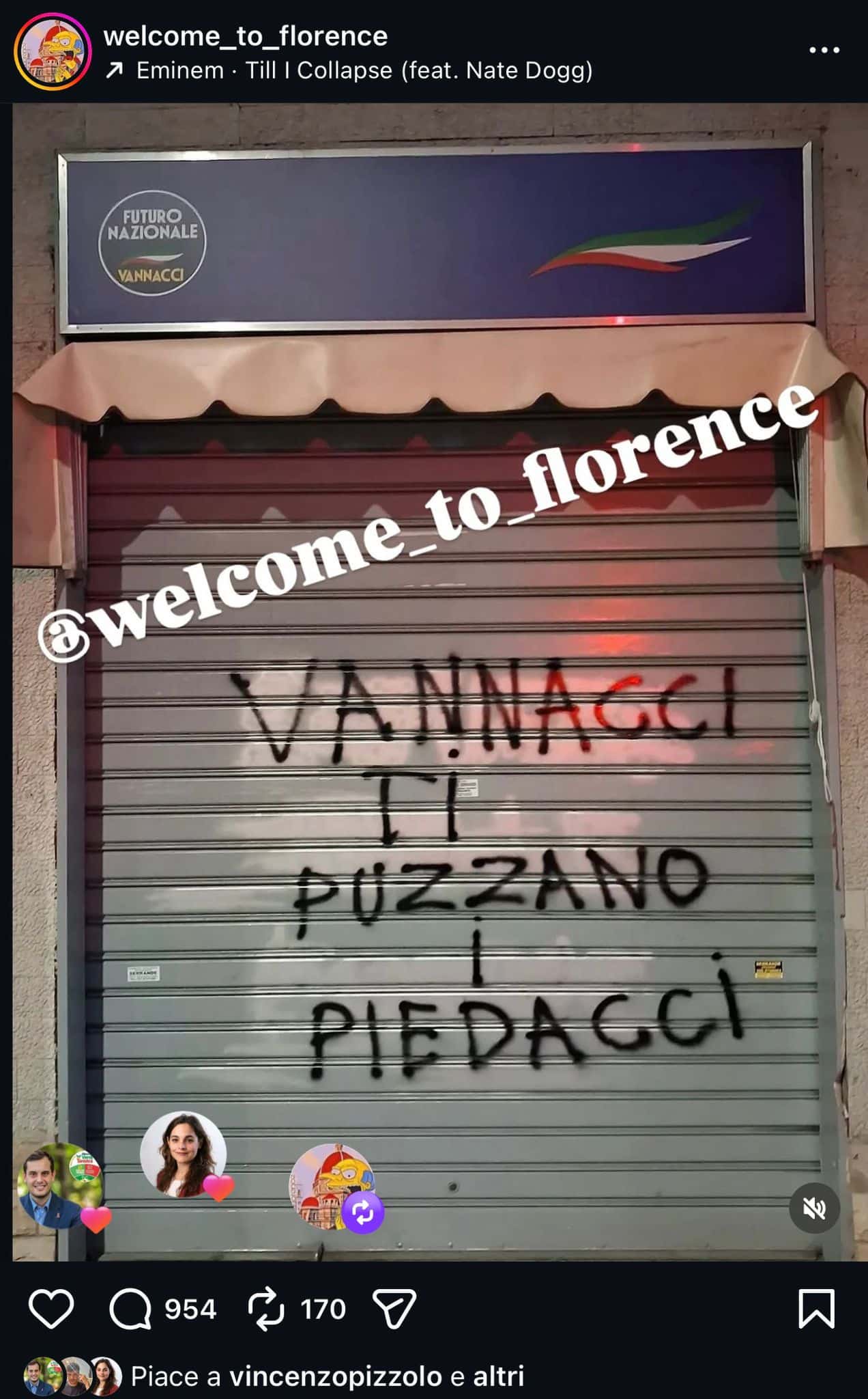 Vincenzo Pizzolo (consigliere comunale di Alleanza Verdi e Sinistra) e Laura Sparavigna (assessore PD della Giunta Funaro) condividono gli insulti a Vannacci e i ripetuti atti vandalici contro l’ormai celeberrima sede di Futuro Nazionale in Piazza Tanucci? Sembrerebbe di sì in quanto hanno messo “mi piace” a un post di Welcome to Florence che dava notizia dell’ennesimo atto vandalico. Un like alla violenza politica e al clima d’odio alimentato in città, quando invece chi siede ai vertici della città – ed è stipendiato da tutti i cittadini/sudditi – dovrebbe lavorare per unire e non dividere, per risolvere i molti problemi concreti.