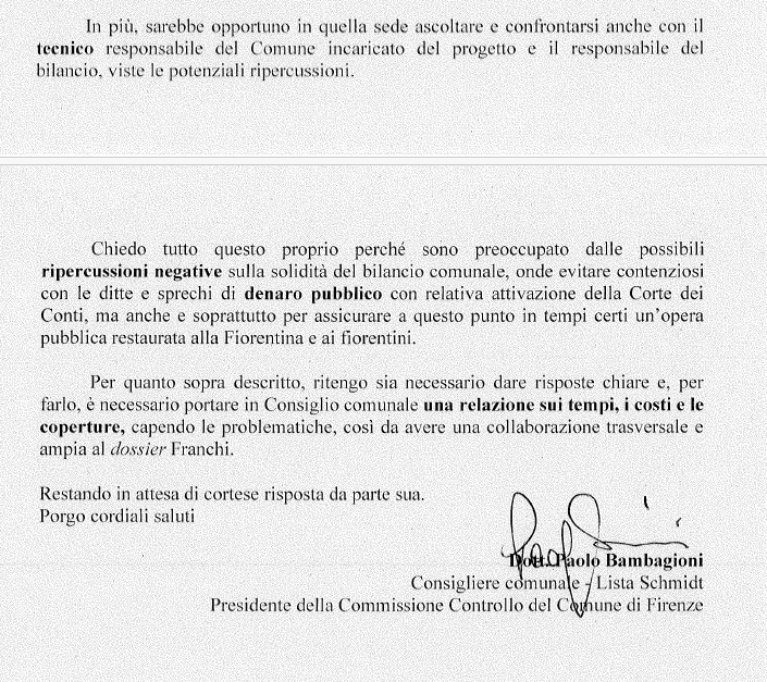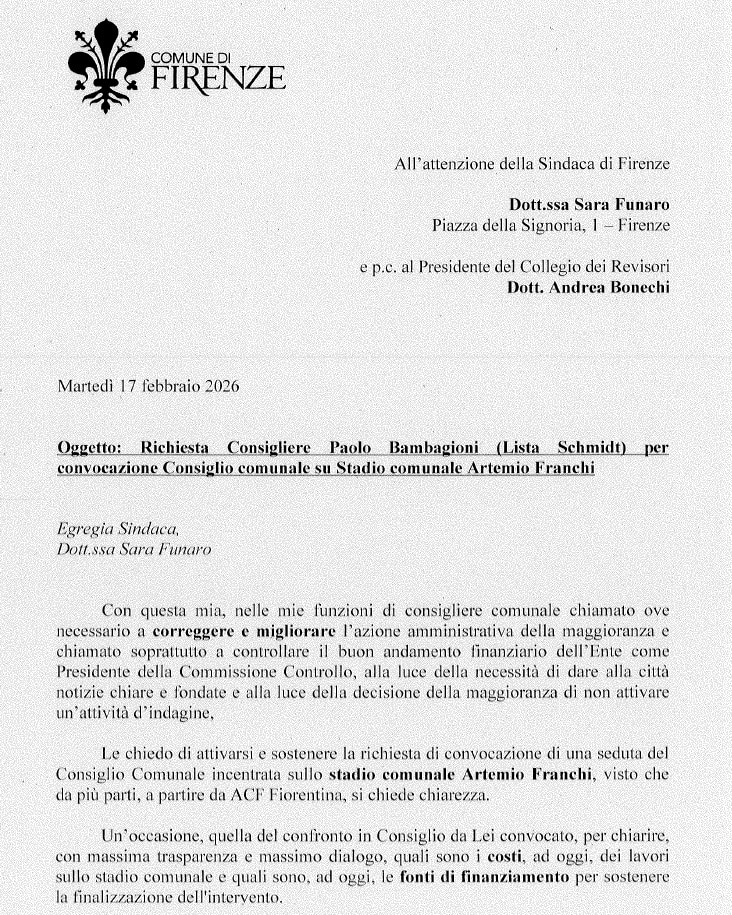 “Un Consiglio incentrato sullo stadio comunale Artemio Franchi”, così da avere “chiarezza dei costi attuali e delle fonti di finanziamento previste, ad oggi, per la finalizzazione di un intervento tanto importante per la Fiorentina e per la città”. La richiesta arriva da Paolo Bambagioni, consigliere comunale della Lista civica Eike Schmidt e presidente della Commissione Controllo del Comune di Firenze, che l’ha messa nero su bianco in una lettera inviata alla sindaca Sara Funaro e, in copia, al presidente del Collegio dei Revisori, Andrea Bonechi.