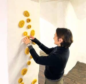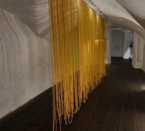 All’interno delle antiche cantine e cucine di Palazzo Machiavelli, l’artista costruisce un’installazione che utilizza la pasta secca come simbolo della dispensa: un gesto quotidiano che diventa rituale e metafora della memoria e dell’assenza. Due candele, posizionate ma non accese, introducono lo spettatore nel progetto, suggerendo la promessa di una luce che non si compie e invitando a riflettere sulla percezione della presenza e dell’assenza.