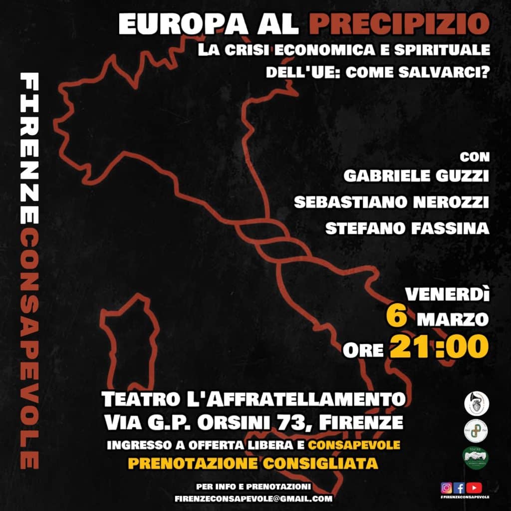 L’Europa è in crisi, non solo sul piano economico, ma anche su quello spirituale e politico. La combinazione di sfide economiche, incertezze politiche e smarrimento dei valori fondamentali sta mettendo a dura prova il futuro dell’Unione Europea. Come uscirne? Quali soluzioni esistono per risollevare un continente che sembra andare incontro al precipizio? Il 6 marzo, presso il Teatro L’Affratellamento di Firenze, si terrà una serata di discussione per provare a dare delle risposte a queste domande, con il contributo di esperti che, da diverse prospettive, affronteranno i nodi cruciali della crisi che sta attraversando l’Europa.