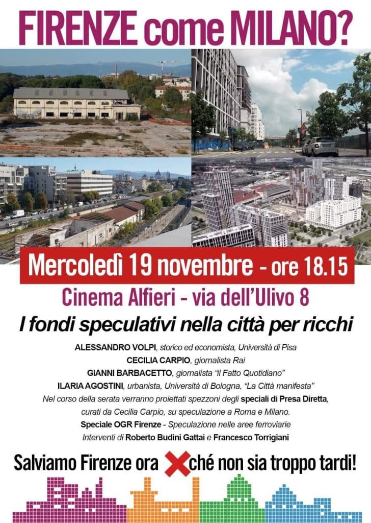 Firenze si interroga sul proprio futuro urbano e lo fa guardando da vicino ciò che è accaduto – e continua ad accadere – a Milano. Mercoledì 19 novembre, alle 18.15, il Cinema Alfieri ospiterà un incontro pubblico dedicato all’impatto dei grandi fondi di investimento sulla trasformazione delle città, un fenomeno che negli ultimi anni ha assunto dimensioni tali da sollevare allarmi, inchieste e prese di posizione civiche.