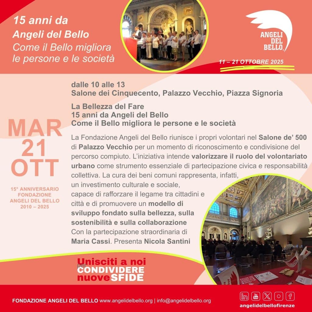 “Siamo una comunità diffusa che dimostra come la bellezza non sia un’eredità passiva, ma un impegno quotidiano che unisce cittadini, istituzioni e imprese” commenta Giorgio Moretti, presidente della Fondazione. “Gli Angeli del Bello sono nati a Firenze, sono cresciuti in numero ed in attività e si sono allargati in tante parti d’Italia a dimostrazione che la bellezza ed il senso civico sono un grande patrimonio di questo meraviglioso paese. Con questo anniversario vogliamo celebrare alcuni valori fondamentali: il civismo, il rispetto per i luoghi e il piacere di condividere il tempo con tante persone. Una piccola comunità che, senza chiedere nulla in cambio, si impegna con generosità a prendersi cura del territorio, offrendo gesti concreti a beneficio di tutti”.