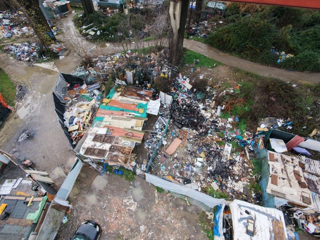 Le foto scattate con drone svelano un paesaggio che pare estratto da uno slum indiano, dove montagne di immondizia si estendono come una discarica a cielo aperto, popolata da senzatetto dimenticati. Dietro le staccionate che delimitano piccoli spazi coltivati ad orto, si vedono baracche, tende improvvisate, rifiuti industriali mescolati a misere masserizie personali, e un terreno melmoso che si fa strada tra un accampamento e l’altro, dove un’umanità disperata si aggrappa ad una sopravvivenza ai confini della dignità.