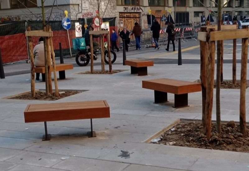 Sorvolando sui piccoli e rachitici alberelli, che dovrebbero trovare linfa vitale con le radici conficcate in un letto di pietra, ciò che ha colpito maggiormente sono le panchine – o pseudo tali – disposte artisticamente in diagonale.