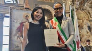 Come da tradizione, ogni edizione degli Scudi di San Martino è accompagnata da un’opera d’arte che ne interpreta il valore simbolico e spirituale. Per l’edizione 2025, su mio consiglio in qualità di curatore d’arte dell’Istituto Scudi di San Martino, è stata scelta l’artista Lynn Guo, pittrice cino-australiana residente a Firenze e cofondatrice di TIAC – The International Arts & Culture Group.