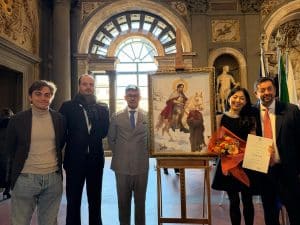 L’opera da lei realizzata, intitolata Il Mantello della Compassione, è stata esposta per la prima volta nel Salone dei Cinquecento e da me personalmente presentata al pubblico nel corso della cerimonia, come testimonianza visiva del tema centrale di quest’anno: la compassione come forma più alta di umanità.