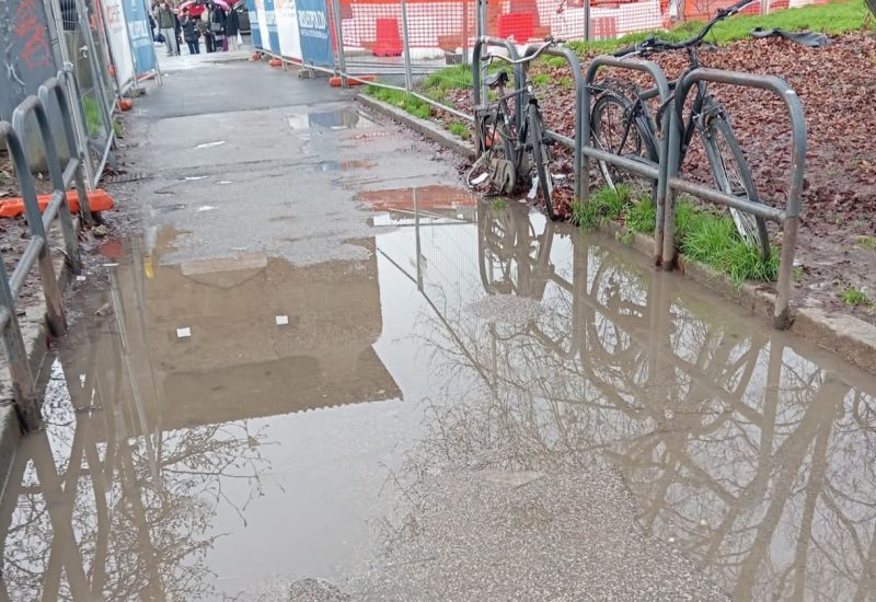 Da una parte si distrugge, si asfalta e si sacrifica la storia per lo sferragliare da lumaca novecentesca del treno-tram si ignora il patrimonio cittadino calpestando secoli di memoria e dall’altra si ignorano persino le più elementari regole del buon senso: garantire ai cittadini la possibilità di camminare senza ritrovarsi con i piedi a mollo.