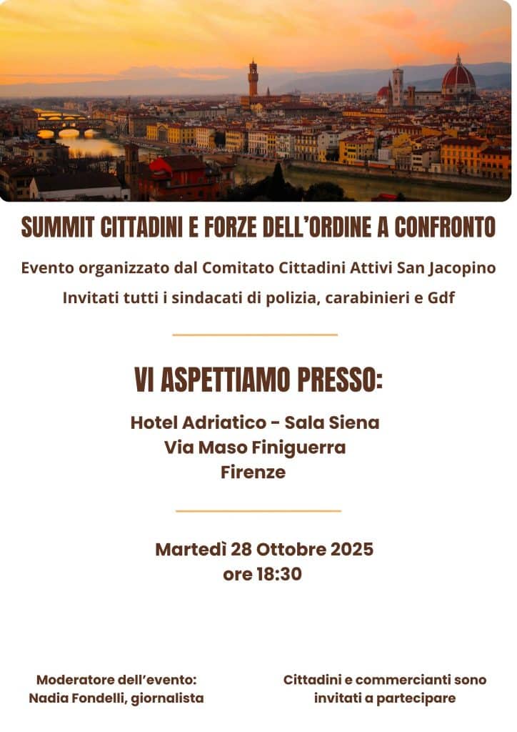 A moderare l’incontro sarà la giornalista Nadia Fondelli, voce nota anche su La Firenze Che Vorrei. “Vi aspettiamo in tanti per sentire direttamente dai tutori dell’ordine le vere problematiche che li affliggono: è importante e, ove possibile, cercare soluzioni da parte di noi cittadini per avere una adeguata risposta alla sicurezza nei nostri quartieri”, conclude il comunicato del Comitato Cittadini Attivi San Jacopino. Un appello sentito alla partecipazione e al confronto, per rafforzare la presenza civile nei processi di tutela del territorio.