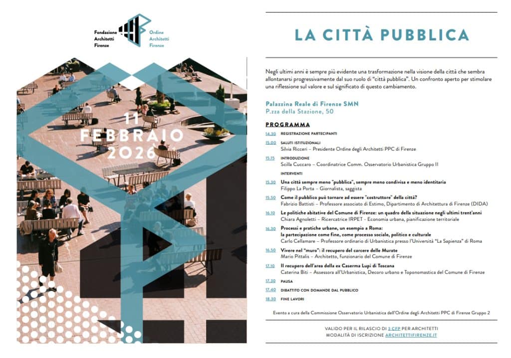 Negli ultimi anni è sempre più evidente una trasformazione nella visione della città che sembra allontanarsi progressivamente dal suo ruolo di “città pubblica”. Un confronto aperto per stimolare una riflessione sul valore e sul significato di questo cambiamento. L’incontro è organizzato a cura della Commissione Osservatorio dell’Urbanistica – Gruppo II dell’Ordine degli Architetti PPC di Firenze.