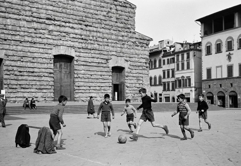 Che fortuna, a pensarci bene. Perché quel piccolo dislivello, quella piazza leggermente sollevata, era esattamente ciò che serviva; uno spazio separato, un campo da calcio naturale, disegnato senza volerlo, ma forse se lo immaginava, dallo stesso Brunelleschi. Guarda la fotografia: ci sono sei ragazzi con i calzoni corti, uno addirittura scalzo, uno con le bretelle, che corrono su quel grande selciato come se la piazza fosse stata costruita apposta per loro, e in fondo lo era. Sullo sfondo la facciata incompiuta di San Lorenzo. Qualche adulto in soprabito passa ai margini senza fermarsi, con la naturale indifferenza di chi è abituato a vedere i bambini giocare e fare chiasso per strada. Una cosa allora normale e giusta. Le automobili non erano ancora arrivate, o meglio, le primissime stavano timidamente affacciandosi sul nostro mondo, ma erano loro a dover aspettare. Aspettavano il primo gol, la fine dell’azione. Era il pallone a comandare.