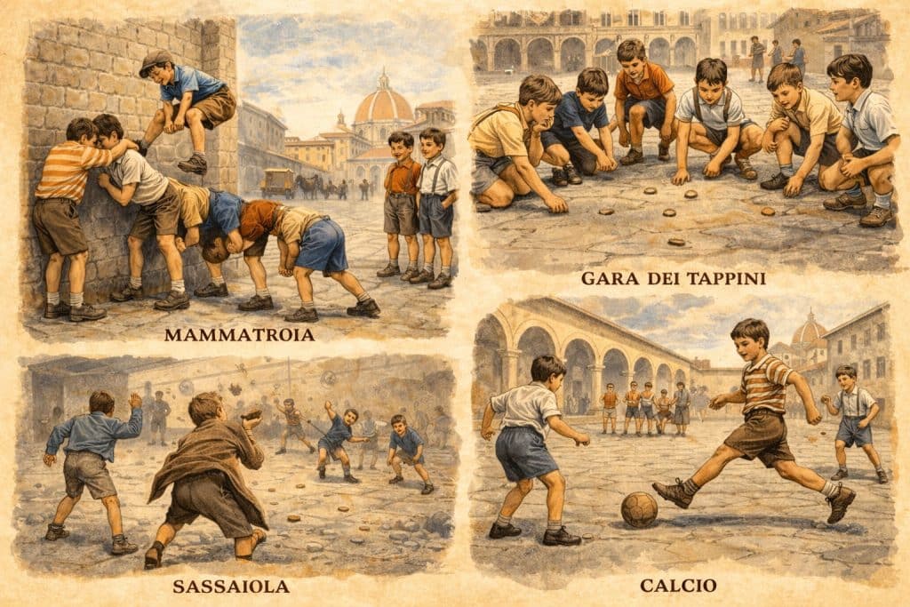 Da Piazza Madonna ci si spostava poi in Piazza San Lorenzo, dove c’era il gruppo dei “San Lorenzini”. Lì si giocava a calcio sul sagrato della Basilica, si faceva la pipì nell’angolo della chiesa che presenta tutt’oggi una cavità che sembrava perfetta per coprirsi nel momento dell’intimità, e poi si partiva per nuove avventure. Si passava dal gioco di “mammatroia” (pensa, un antico gioco rinascimentale con quel nome) alla tavoletta con i cuscinetti a sfera, una specie di monopattino artigianale costruito con quello che si trovava. E poi c’erano i sempre “gavidi” tappini. Ognuno aveva il suo tappo delle bibite preso dal banco delle gazose appoggiato al monumento di Giovanni delle Bande Nera, ben lucidato sul fondo e riempito di cera per renderlo più pesante, e una pallina di terracotta per correre nelle piste disegnate sul sagrato o sui mucchietti di rena lasciati dai muratori, piste che erano vere e proprie opere d’ingegneria infantile. La fontanina del Giovanni delle Bande Nere (oggi chiusa) era il caricatore perpetuo per le nostre pistole a schizzo e la guerra condotta tra i barrocci. E a proposito di cortile dove noi bimbi giocavamo, ricordo le sassaiole nel chiostro di San Lorenzo con i’ Prota, il responsabile del chiostro, che ci rincorreva con “ragazzacci andate da un’altra parte a fare chiasso”. Il chiostro era pieno di piccoli sassi e quindi perfetto per questo gioco. Si formavano due squadre, ci si riempiva le tasche e le mani di sassi e poi, nascosti dietro le siepi, ci si tirava addosso le nostre munizioni. Quella era la sassaiola. Quando i sassi finivano e qualcuno riportava qualche escoriazione in più, la battaglia terminava e si andava a cercare un altro gioco, tutti insieme.