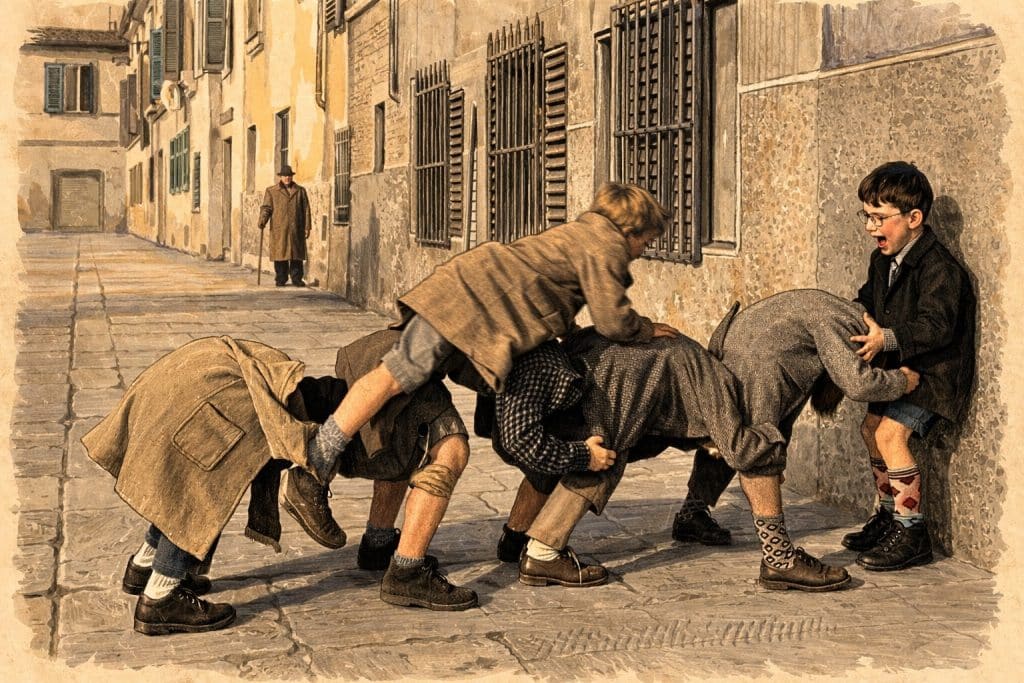 E tra i ricordi più strani penso ancora alle piattole che uscivano da sotto i gradoni della piazza. Noi le catturavamo con i tappini delle gazzose e poi le schiacciavamo. Che schifo! Anche quella, in fondo, era una delle tante piccole guerre della nostra infanzia. Quando i giochi non bastavano più, arrivava l’avventura. Molti di noi, io per primo, ci attaccavamo dietro al tram. Il retro del tram, con i suoi appigli di ferro, sembrava fatto apposta per trasportare gratis i bambini da una parte all’altra della città. Non avevamo bisogno di andare da nessuna parte. Era solo il gusto di fare qualcosa di proibito. Alle fermate il controllore ci intimava di scendere. Passava un minuto e noi eravamo di nuovo aggrappati dietro. Quando non passavano i tram ci sedevamo sulla barra tra le molle di legno delle carrozze trainate dai cavalli. I fiaccherai si arrabbiavano, soprattutto se avevano clienti a bordo, e con la frusta frustavano l’aria all’indietro per farci scendere. Ma proprio questo rendeva l’avventura ancora più avventurosa, e quindi ci attirava come un magnete.