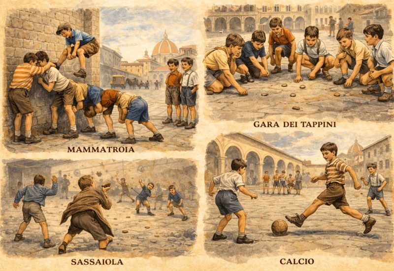 Da Piazza Madonna ci si spostava poi in Piazza San Lorenzo, dove c’era il gruppo dei “San Lorenzini”. Lì si giocava a calcio sul sagrato della Basilica, si faceva la pipì nell’angolo della chiesa che presenta tutt’oggi una cavità che sembrava perfetta per coprirsi nel momento dell’intimità, e poi si partiva per nuove avventure. Si passava dal gioco di “mammatroia” (pensa, un antico gioco rinascimentale con quel nome) alla tavoletta con i cuscinetti a sfera, una specie di monopattino artigianale costruito con quello che si trovava. E poi c’erano i sempre “gavidi” tappini. Ognuno aveva il suo tappo delle bibite preso dal banco delle gazose appoggiato al monumento di Giovanni delle Bande Nera, ben lucidato sul fondo e riempito di cera per renderlo più pesante, e una pallina di terracotta per correre nelle piste disegnate sul sagrato o sui mucchietti di rena lasciati dai muratori, piste che erano vere e proprie opere d’ingegneria infantile. La fontanina del Giovanni delle Bande Nere (oggi chiusa) era il caricatore perpetuo per le nostre pistole a schizzo e la guerra condotta tra i barrocci. E a proposito di cortile dove noi bimbi giocavamo, ricordo le sassaiole nel chiostro di San Lorenzo con i’ Prota, il responsabile del chiostro, che ci rincorreva con “ragazzacci andate da un’altra parte a fare chiasso”. Il chiostro era pieno di piccoli sassi e quindi perfetto per questo gioco. Si formavano due squadre, ci si riempiva le tasche e le mani di sassi e poi, nascosti dietro le siepi, ci si tirava addosso le nostre munizioni. Quella era la sassaiola. Quando i sassi finivano e qualcuno riportava qualche escoriazione in più, la battaglia terminava e si andava a cercare un altro gioco, tutti insieme.