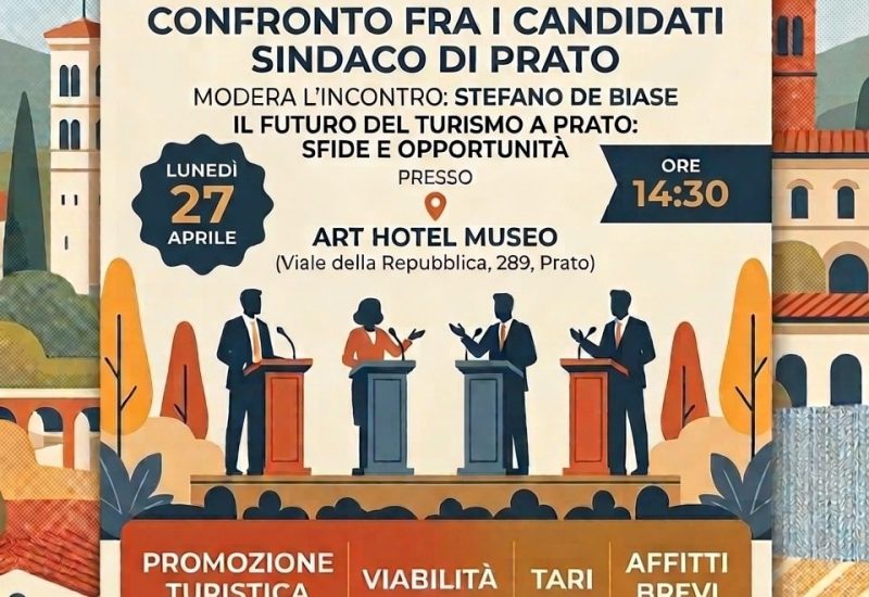 Saranno turismo, viabilità, affitti brevi e costi per le imprese alcuni dei temi al centro del confronto pubblico tra i candidati a sindaco di Prato, promosso da Federalberghi Prato in programma lunedì 27 aprile, alle ore 14.30, all’Art Hotel Museo di viale della Repubblica. Un confronto che riunirà i principali protagonisti della corsa al palazzo comunale per discutere delle prospettive e delle criticità del comparto ricettivo. Un’iniziativa che vuole essere un momento significativo della campagna elettorale sul fronte economico e dei servizi, con l’obiettivo di sottolineare le esigenze del settore.