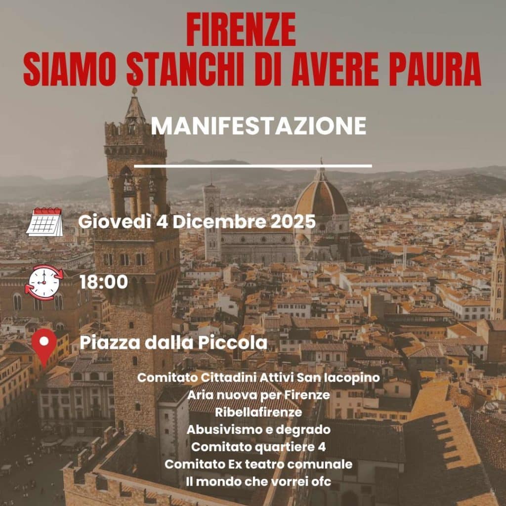 “Giovedì 4 dicembre alle ore 18 in piazza Dalla Piccola nel quartiere di San Jacopino, tutti a gridare che siamo stanchi di avere paura nella nostra città. Ci ritroviamo con tutte le associazioni, i comitati, i gruppi Facebook di Firenze, non per accusare qualcuno, non per fare un attacco politico a qualcuno, ma solo per far capire a tutte le istituzioni e a tutte le persone che sono responsabili della nostra sicurezza che ormai siamo stanchi di avere paura.