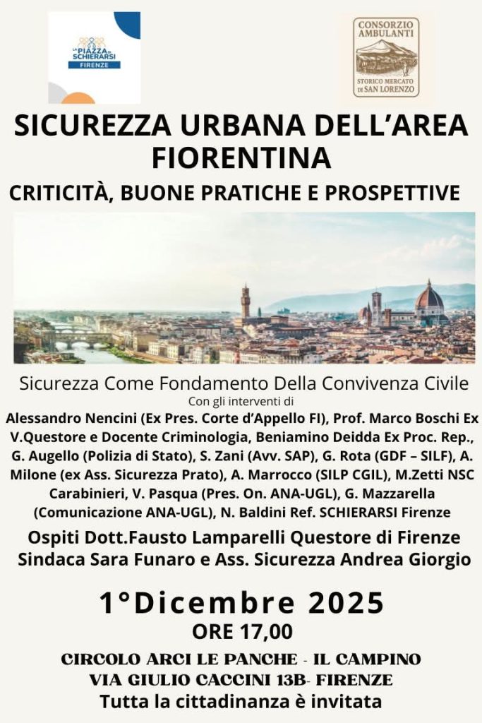 Lunedì 1° dicembre 2025, alle ore 17:00, il Circolo Arci Le Panche – Il Campino (via Giulio Caccini 13b) avrebbe dovuto ospitare il convegno pubblico «Sicurezza urbana dell’area fiorentina: criticità, buone pratiche e prospettive», organizzato dal Consorzio Ambulanti del Mercato Storico di San Lorenzo.