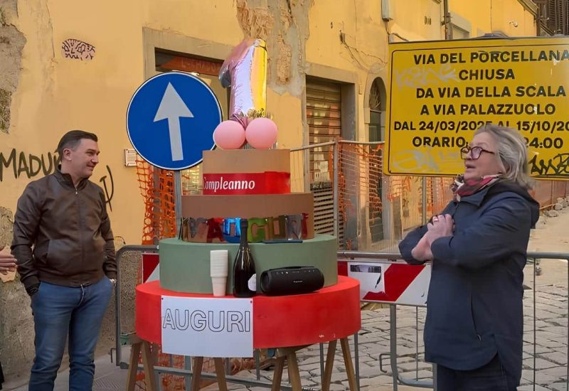 Dopo il lancio dell’iniziativa “Adotta la tua transenna del cuore”, ecco che in via del Porcellana i residenti festeggiano il primo compleanno dei lavori fantasma di Publiacqua, che avrebbero dovuto concludersi a fine mese. Ieri, 24 marzo, si è svolta in loco una festa partecipata “per rendere omaggio a questo monumento del degrado amministrativo”. E, puntualmente, i residenti (e non solo) si sono recati sul posto con addobbi, cotillons e la torta (di cartone) di circostanza.